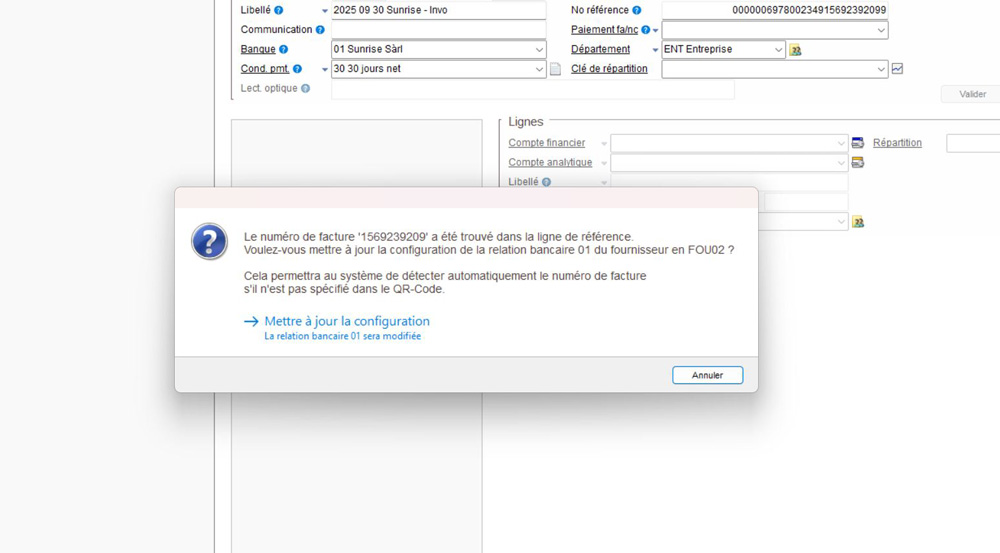 Le numéro de facture est également extrait du QR code à partir du n° de référence. Lorsque l’information n’est pas claire, un n° est proposé et il est possible de saisir le n° de facture manuellement.